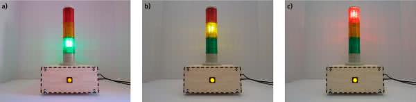 W urządzeniu zastosowano przemysłowy sygnalizator w postaci trójkolorowej kolumny świetlnej. Pracą kolumny steruje komputer jednopłytkowy Raspberry Pi. Skrypt zainstalowany na minikomputerze pracującym pod kontrolą systemu operacyjnyego Linuks, regularnie mierzy czas odpowiedzi szeregu stron internetowych z wykorzystaniem komendy ping. W momencie, gdy ponad 50% zapytań wysyłanych poprzez ping dochodzi do adresatów, system zapala zielone światło (rysunek 1a), w momencie, gdy odsetek poprawnych pingów mieści się pomiędzy 1% a 50%, zapalony zostaje żółty sygnalizator (rysunek 1b), a jeżeli wszystkie pingi nie dochodzą do celu, to zapalone zostaje światło czerwone (rysunek 1c).