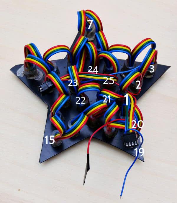 Kolejnym elementem ozdobnym, jaki wykonamy, jest gwiazda RGB. Dzięki zastosowaniu trójkolorowych diod LED możliwa jest zmiana barwy ich świecenia na niemalże dowolny kolor. Moduły WS2801, zastosowane w tym projekcie, integrują w sobie sterownik PWM dla diody RGB z interfejsem cyfrowym. Po połączeniu sterowników z dyskretnymi diodami LED RGB stanową one całość, jak pokazano na fotografii 7. Dzięki temu ich połączenie jest niezwykle proste – diody łączy się szeregowo. Po umieszczeniu wszystkich diod w przygotowanej obudowie (patrz fotografia 8) łączymy je ze sobą szeregowo. Autor projektu wykonał gwiazdę z drewna, w której umieścił 25 diod LED RGB w podstawce z ABS-u. Przykrył ją następnie fragmentem mlecznej pleksi, aby rozmyć światło – dzięki temu gwiazda świeci bardziej jednorodnie i nie są widoczne poszczególne punkty świetlne.