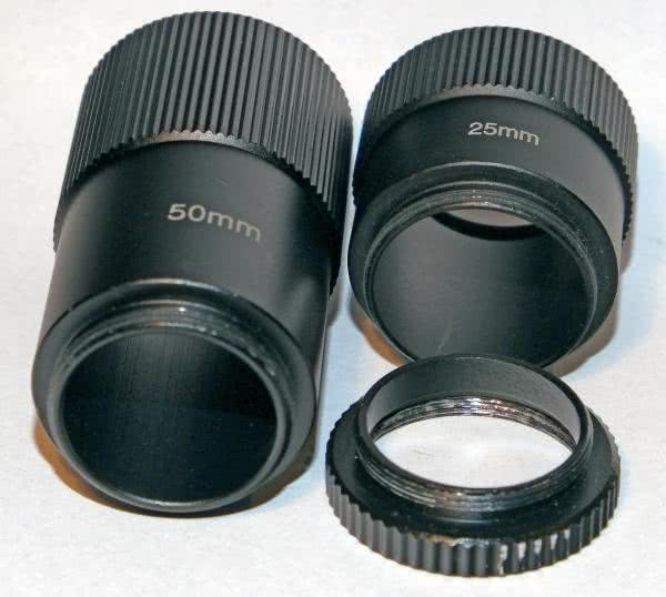 „Pierścienie” to zwykły kawałek czernionej rurki aluminiowej z gwintem WZ, zwiększający skalę powiększenia poprzez odsunięcie obiektywu od przetwornika obrazu. Dla modelowego obiektywu warto sprawdzić długości 5...25 mm. Dłuższe pierścienie zmniejszają odległość do przedmiotu i głębię ostrości (odległość, w której obiekty są ostre w odniesieniu do punktu ustawienia ostrości), zmniejszają jasność obrazu i stwarzają problemy z podświetleniem płytki, więc raczej ich nie polecam.