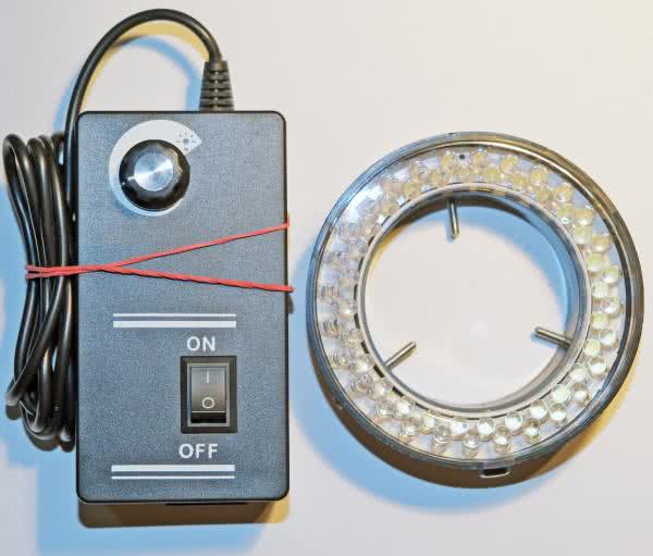 Pozostaje sprawa podświetlenia płytki, tutaj także wybór padł na gotowe rozwiązanie wykorzystywane w fotografii makro, tj. pierścieniową lampę podświetlającą. Modelowa lampa to 60LED Adjustable Ring Light Illuminator Lamp. Lampa ma w komplecie zasilacz sieciowy z regulowaną jasnością podświetlenia oraz uniwersalne śrubowe mocowanie do średnicy 58 mm, co wystarcza, aby bez dodatkowych elementów mechanicznych zamocować ją na obiektywie (fotografia 3).