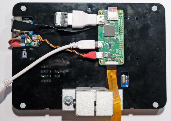 Mikroskop został zaprojektowany jako urządzenie samodzielne, więc musi mieć ekran, w modelu zastosowano wysokiej jakości wyświetlacz Waveshare 7” HDMI o rozdzielczości 1024×600 px dający wysoki komfort użytkowania. Bez najmniejszych problemów można zastosować inną matrycę LCD (np. z uszkodzonego tabletu lub laptopa) wraz z kompatybilną płytką interfejsu, dostępną na aukcjach internetowych (konwerter HDMI/VGA/AV na RGB LVDS) lub wręcz monitor HDMI, o ile mamy wystarczającą ilość miejsca. Modelowy wyświetlacz ma w komplecie ramkę i płytę montażową, w której konieczne jest wywiercenie kilku otworów mocujących (fotografia 4) dla Pi Zero, płytki gniazda micro USB i mocowania do statywu.