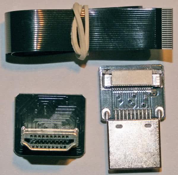 Do podłączenia interfejsu HDMI wykorzystano dostępne na aukcjach przejściówki HDMI na taśmę elastyczną (20CM FPV HDMI Type A Male to Down 90 Degree Angled HDMI Male HDTV FPC Flat Cable), gdyż dostępne kable HDMI, oprócz sztywności, są zbyt długie, co utrudnia ich montaż. Niestety nie znalazłem gotowej przejściówki kątowej HDMI/mini HDMI, więc wspomagam się przejściówką z Raspberry Zero i taśmą elastyczną (fotografia 5).
