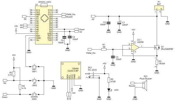 Obwód interfejsu użytkownika składa się z dwóch przycisków i modułu wyświetlacza OLED o przekątnej 0,96”, sterowanego przez interfejs I2C. Dwa przyciski opisane są jako UP i DOWN i służą do zwiększania lub zmniejszania szerokości impulsu PWM, co pozwala na sterowanie prądem rozładowywania akumulatora. Oporniki R2 i R4 podciągają w górę obie linie podłączone do przycisków. Trzeci przycisk (RST) służy do resetowania modułu Arduino.