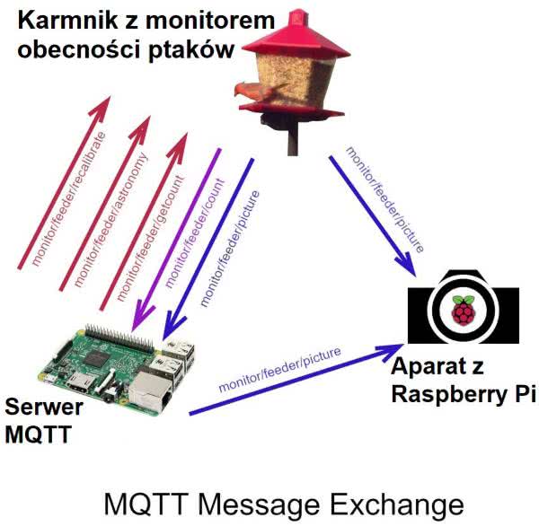 Karmnik dla ptaków jest wyposażony w Raspberry Pi Zero W i pojemnościowy czujnik dotykowy. Wszelkie ptaki siadające na monitorowanych żerdziach karmnika aktywują czujnik, który uruchamia z kolei licznik czasu, aby określić czas trwania każdego zdarzenia. Gdy tylko czujnik dotykowy zostanie aktywowany, komunikat MQTT monitor/feeder/picture zostanie opublikowany przez monitor karmnika. Wiadomość ta informuje aparat z Raspberry Pi o konieczności zrobienia zdjęcia. Jeśli serwer MQTT opublikuje komunikat monitor/feeder/getcount, monitor karmnika odpowie komunikatem MQTT monitor/feeder/count, który serwer zapisze w bazie danych. Dokładny przepływ komunikatów pomiędzy poszczególnymi blokami urządzenia pokazany został na rysunku 1.