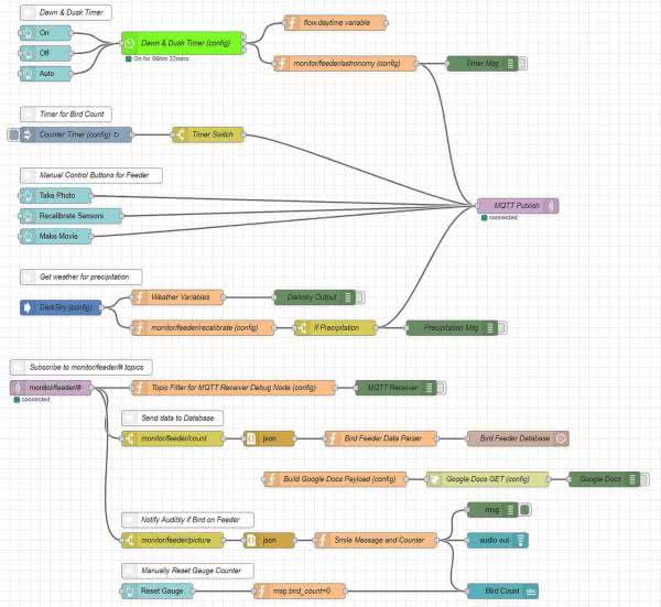 Bird_Feeder_Monitor_Flow zawiera interfejs użytkownika, zapewniający dostęp do serwera MQTT za pośrednictwem np. telefonu komórkowego. Monitor można ręcznie włączać lub wyłączać, ponownie skalibrować czujniki lub manualnie zrobić zdjęcia. Pokazana jest również suma „dotknięć” czujnika, co daje przybliżone wyobrażenie o liczbie ptaków odwiedzających karmnik.