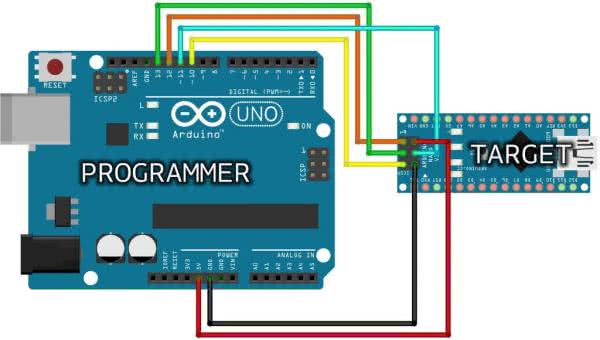 Ponadto Arduino z oprogramowaniem mocoLUFA posiada port szeregowy, który umożliwia Flashowanie oprogramowania wbudowanego na innych modułach przez ten kontroler, zależnie od tego, w jakim trybie się go uruchomi. Do zaprogramowania Arduino Micro potrzebny jest programator ISP, emulowany przez moduł Arduino UNO, jak pokazano na rysunku 5, podłączony do komputera przez USB.