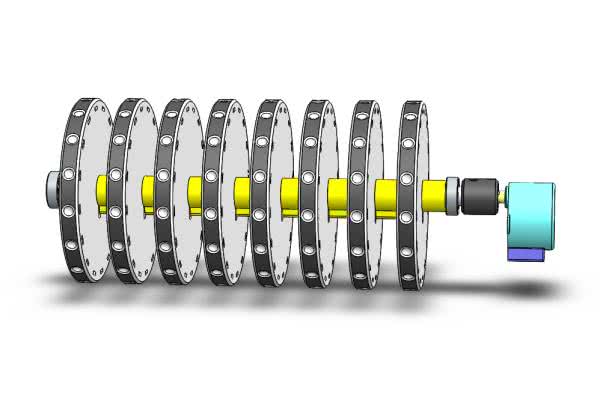 Zespół ośmiu kół umieszczany jest następnie na wspólnej osi. Jako oś wykorzystano stalowy wałek o średnicy 8 mm i długości 184 mm. Taki wałek zamówić można z sklepu z akcesoriami do automatyki lub modeli RC. Pomiędzy poszczególnymi kołami umieszczane są dystanse o szerokości 10 mm, co odpowiada rastrowi, z jakim rozmieszczone są sensory Halla w podstawie urządzenia. Oś z jednej strony zakończona jest nakładką, zabezpieczającą koła przed wysunięciem się i łożyskiem 688zz. Po drugiej stronie również znajduje się dokładnie takie samo łożysko oraz uchwyt dla silnika, który pozwala na sztywne połączenie osi kół z osią silnika krokowego. Wszystkie elementy, oprócz osi i łożysk, wykonane są w technologii druku 3D. Na rysunku 4 pokazano model 3D kół z magnesami, zainstalowanych na osi połączonej z silnikiem krokowym.