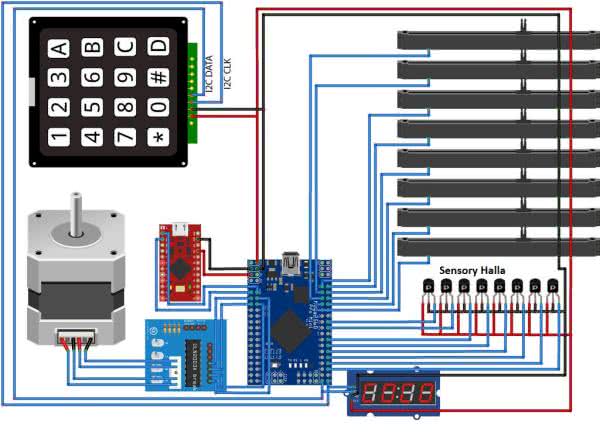 Po zaprogramowaniu modułu Arduino Micro można podłączyć go do Arduino Mega, które pełni w sterowniku kluczową rolę. Jak pokazano na rysunku 6, wszystkie elementy systemu sterowane są właśnie przez ten moduł. Szczegóły połączeń elektrycznych w systemie zawarto na rysunku 6 jak i w tabeli 1.