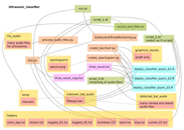 Wybór środowiska Bash do nagrywania fragmentów audio był dość oczywisty, ze względu na łatwość korzystania z bibliotek Alsa i zdolność do nagrywania w jakości 384 kbps. Bash pozwolił również na ścisłą kontrolę kolejności uruchamiania poszczególnych modułów, jako że niektóre bloki kody muszą być uruchamiane liniowo – działać jeden po drugim. Jest to najbardziej oczywiste w przypadku wdrażania modeli Random Forest, ponieważ trzeba je ładować do pamięci tylko raz na sesję, zamiast ładować za każdym razem, gdy wymagana jest klasyfikacja. Organizacja całego stosu była finalnie dosyć skomplikowana, ale dzięki dokumentacji każdego skryptu wszystko działa w zoptymalizowany sposób. Poszczególne skrypty komunikują się między sobą poprzez odpytywanie różnych plików tekstowych w katalogu „helpers”, które bardzo często nie zawierają nawet żadnej zawartości.