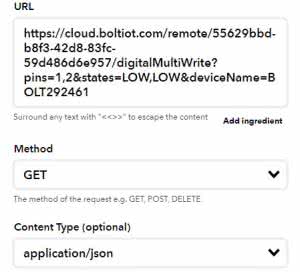 6. Wybierz z menu Webhooks a następnie Make a web request (wyślij zapytanie webowe). Teraz wprowadzić trzeba URL do API naszego Bolta, ma ono format: https://cloud.boltiot.com/remote/<API-KEY>/digitalMultiWrite?pins=1,2&states=LOW,LOW&deviceName=<DEVICE-ID>, gdzie: API KEY to nasz klucz do API Bolta, a DEVICE ID to, oczywiście, numer ID naszego modułu.