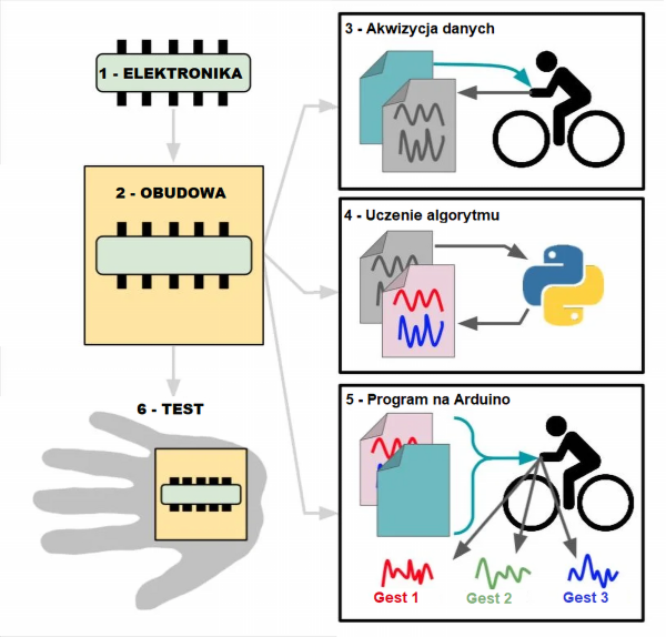 Ogólny plan pracy nad urządzeniem, z podziałem na etapy, pokazano na rysunku 2. Obejmuje on tak pracę nad sprzętem (elektroniką i jej integracja z rękawiczka oraz obudową), jak i prace nad inteligentnym oprogramowaniem do sterowania światłami.