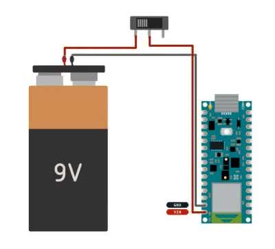 Układ elektroniczny, który instaluje się w rękawiczce, jest bardzo prosty. Składa się z trzech elementów (rysunek 3): modułu Arduino Nano 33 BLE SENSE, baterii 9 V do zasilania oraz włącznika (autor zastosował hebelkowy, ale dowolny przełącznik w konfiguracji SPDT będzie się tutaj nadawał). Dzięki temu, że wszystkie wymagane sensory (żyroskop i akcelerator) zintegrowane są na płytce Arduino, nie ma potrzeby podłączania dodatkowych czujników do płytki, co upraszcza cały układ.