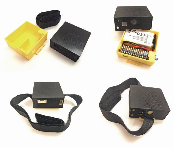 Pierwsza żółta część zawiera płytkę Arduino, baterię i przełącznik. Autor dodał wycięcie, które pozwala na ładowanie zastosowanego akumulatora (ogniwo w formie baterii 9 V, ładowane poprzez microUSB). Wycięcia pozwalają również na programowanie modułu Arduino bez konieczności rozbierania obudowy. W części czarnej, przygotowane zostały podobne otwory jak w pierwszej części obudowy. Dodatkowo jest też otwór w miejscu, gdzie znajduje się dioda LED RGB na płytce. Dzięki temu widoczne jest światło diody, mimo że układ zamknięty jest w obudowie.