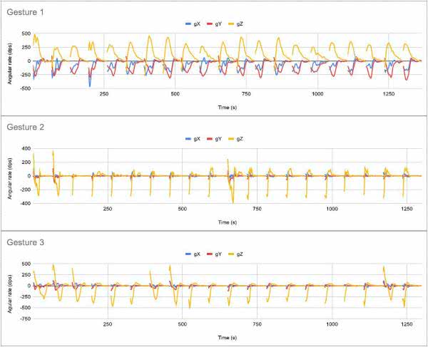 Program posiada prekonfigurowany próg wartości żyroskopu. Po jego przekroczeniu, Arduino zaczyna przesyłać pomiary do komputera, celem rejestracji. Szkic zapala diodę LED na inny kolor co 20 ruchów. W ten sposób wiadomo, kiedy zmieniać wykonywany gest (potrzebne jest wiele powtórzeń tego samego gestu, aby stworzyć zbiór uczący).