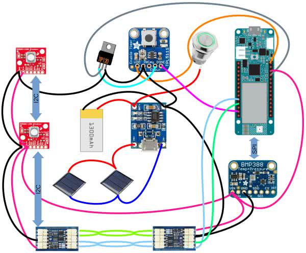 Zasilanie czujników i BMP388 pochodzi z płytki głównej, gdy jest ona włączona. Rezystory podciągające są we wzmacniaczach I2C i nie ma konieczności dodawania ich do interfejsu. Moduł ładowarki TP4056 działa świetnie z dwoma panelami słonecznymi i dołączoną baterią 18650 lub podobną. Przycisk łączy wyjście baterii z małym ekranem poziomu baterii. Dwa czujniki dołączone do zanurzonego sensora, wykorzystują dwa dostępne adresy, w tym adres układu BMP388 (0x77), więc jeśli wykorzystuje się dwa czujniki, to układ BMP388 musi być podłączony do układu poprzez SPI.