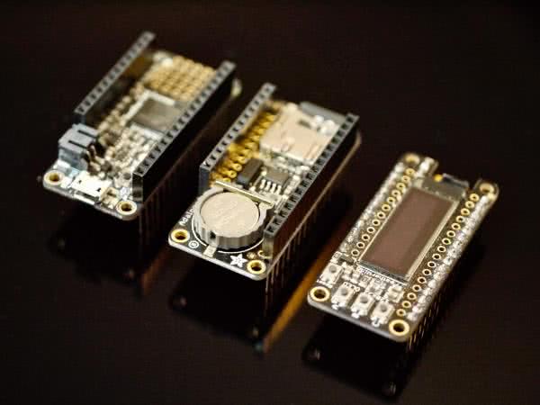 Pierwszym zadaniem jest zainstalowanie goldpinów w poszczególnych modułach - mikrokontrolerze Feather i modułach Featherwings. Trzy PCB można następnie ułożyć w stos lub umieścić obok siebie na płytce prototypowej lub w module Featherwing Tripler. W przypadku tych ostatnich rozwiązań wystarczy wyposażyć każdą płytkę w dołączone do niej proste goldpiny.