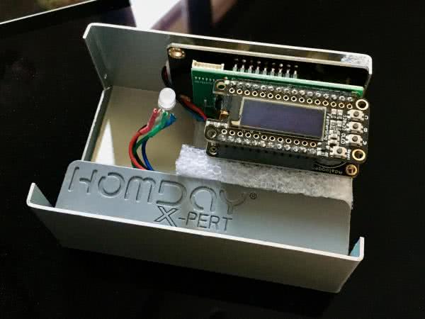 Moduły zastosowane w urządzeniu zostały pokazane na fotografii 1. Featherwing OLED, jak sama nazwa wskazuje, to mały ekran OLED, który komunikuje się przez I2C z mikrokontrolerem. Ciekawą cechą zalecanego tutaj modelu wyświetlacza jest obecność trzech przycisków (A, B i C), które służą w systemie do interakcji z interfejsem urządzenia.