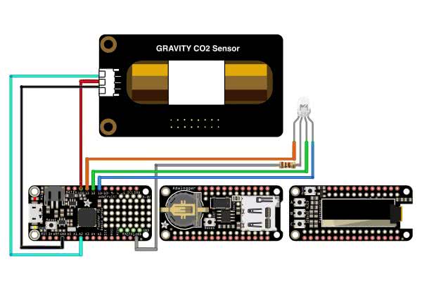 Pozostała część obwodu jest dosyć prosta. Trzy ułożone w stos płytki łączą się ze sobą w naturalny dla siebie sposób. Do nich pozostaje nam podłączyć tyko diodę LED RGB oraz czujnik CO2 i zasilanie. Dioda LED jest podłączona do pinów I/O nr 13 (czerwona), 12 (niebieska) i 11 (zielona), a jej wspólna katoda jest podłączona do masy. Można wybrać inne piny, ale ten konkretny wybór był uzasadniony potrzebą uniknięcia stosowania pinu 10, na który wpływa komunikacja sprzętowa SPI między mikrokontrolerem a płytką Adaloggera. Poza tym na płytkach Feather (i w większości płytek Adafruit) pin numer 13 jest połączony z czerwoną diodą LED SMD znajdującą się na samej płytce. Przy tym wyborze połączenia, czerwony kanał zewnętrznej diody LED RGB zawsze naśladuje czerwoną diodę LED na płycie, co może być wygodne przy debugowaniu. Ważne jest, aby dokładnie sprawdzić, które piny są domyślnie używane przez shieldy lub moduły Featherwings, z którymi łączy się z płyta główną, aby uniknąć konfliktów.