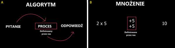 Hasło „uczenie maszynowe” brzmi fantazyjnie i skomplikowanie. W rzeczywistości jest dosyć prostym konceptem, szczególnie w porównaniu do niektórych złożonych konwencjonalnych algorytmów. W przypadku większości algorytmów, gdy trzeba znaleźć odpowiedź na jakieś pytanie, musimy zaprogramować pewną sekwencję procesów, które system musi wykonać, aby uzyskać wynik końcowy. Ujęto to schematycznie na rysunku 2, prostym przykładem może być mnożenie. Jeśli chcemy znaleźć odpowiedź na problem w postaci mnożenia, znaleźć iloczyn liczb 2 i 5, możemy po prostu powiedzieć komputerowi, aby wykonał odpowiednio wiele działań dodawania i uzyskał poszukiwaną odpowiedź. Dokładnie tak, jak pokazano na rysunku 2b.