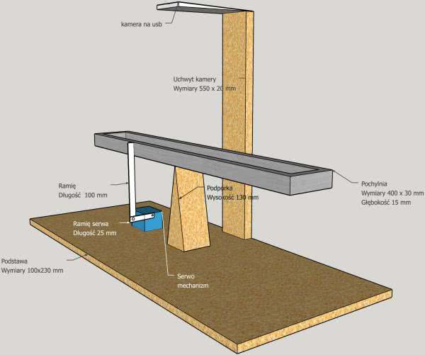 Bardzo ważną rzeczą przy budowie konstrukcji jest eliminacja luzów, które mogą się pojawić na ramieniu łączącym serwomechanizm z pochylnią jak i na łączeniu pochylni z podporą.