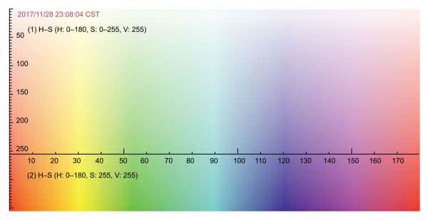 Maskę w bibliotece OpenCV tworzy się w przestrzeni barw HSV, dlatego należy wykonać konwersję z BGR na HSV. Biblioteka OpenCV operuje na mapowanych zakresach HSV. Tabela 1 zawiera zmapowane wartości. W wybieraniu dolnego i górnego zakresu pomocny jest rysunek 5. Wartość V można dobrać bazując na popularnych Color picker-ach dostępnych w Internecie.