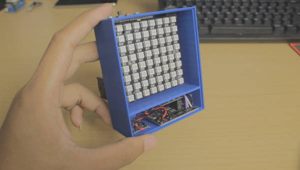Lampa zawiera opisany powyżej kontroler oraz panel RGB, który stanowi macierz 8×8 modułów LED RGB. Cały system uzupełnia akumulator typu 18650, zasilający całość i czyniący całe urządzenie przenośnym. Obudowa lampy wykonana jest w technologii druku 3D. Projekt obudowy można pobrać ze strony z projektem. Jest ona relatywnie prostą konstrukcją otwartą z jednej strony.