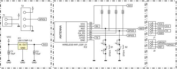 W systemie zaimplementowano najprostszy, podstawowy schemat użycia modułu ESP-01. Rezystor 10 kΩ służy do podciągnięcia pinów konfiguracyjnych ESP-01, wymuszając tryb normalnej pracy. W systemie są da przyciski – jeden służy do restartowania systemu, a drugi do uruchomienia trybu programowania. Jak pokazano na rysunku 1, przyciski podłączone są pod linie RST oraz GPIO0. Jest to bardzo istotne, gdyż pozwala na wykorzystanie wbudowanego w ESP-01 bootloadera i programowanie mikrokontrolera przez prosty interfejs UART.