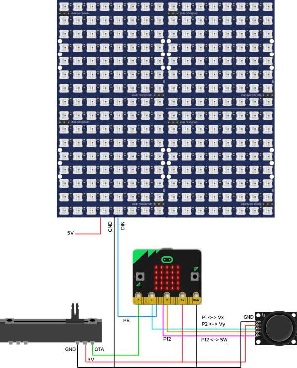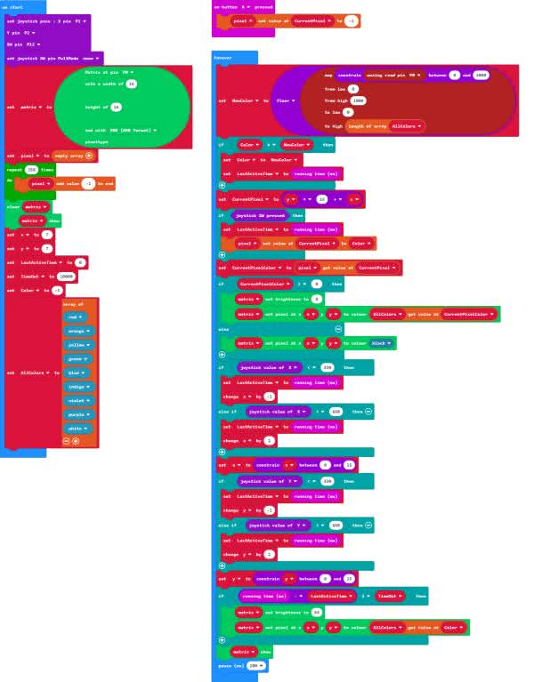 W zaprezentowanej konstrukcji do micro:bit podłączono macierz diod LED RGB (w postaci modułów WS2812B), joystick i potencjometr. Moduł micro:bit odczytuje sygnał z joysticka i steruje ruchami kursora (góra, dół, lewo i prawo). Możliwe jest nawigowanie kursorem do dowolnych punktów na panelu LED RGB o wymiarach 16×16. Płytka micro:bit może również odczytywać wartość analogową z potencjometru, aby określić, jaki ma być kolor kursora. W tym programie dostępnych jest 9 predefiniowanych kolorów (czerwony, pomarańczowy, żółty, zielony, niebieski, indygo, fioletowy, fioletowy i biały).