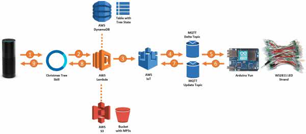 Ostatnim zaawansowanym elementem, który pozwala na tworzenie zadziwiających systemów sterowania są usługi w chmurze. W tym projekcie skorzystano z ekosystemu Amazon Web Services, który w prosty sposób można zintegrować z asystentem głosowym Amazon Alexa. Dzięki temu można sterować choinką (czy dowolnym systemem) za pomocą prostych komend głosowych. Opisany projekt wykorzystuje asystenta Amazon Alexa, do sterowania łańcuchami diod RGB, zawieszonymi na choince. Dalsza część artykułu omawia komponenty sprzętowe, zawierające moduł Arduino, oraz oprogramowanie, podzielona na dwie części – firmware, pracujące na module Arduino oraz oprogramowanie pracujące w chmurze.