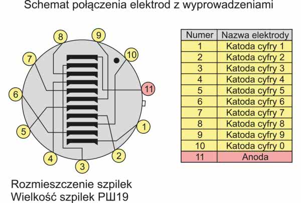 Istnieje duża różnorodność lamp Nixie, dostępne są w najróżniejszych kształtach i formach. Na ogół maja do 10 katod, do wyświetlania cyfr od 0 do 9. Tak jest w przypadku lampy typu IN-1, która posłuży jako przykład w tym artykule (fotografia tytułowa). Jest ona krótką, przysadzistą lampą elektronową z cyframi widocznymi od góry, czyli po przeciwnej stronie do wyprowadzeń złącza, które wtyka się do odpowiedniego gniazda. Taki kształt pozwala na konstrukcję relatywnie kompaktowych układów wyświetlaczy. Lampa Nixie IN-1 ma 11 wyprowadzeń: 1...10 są katodami, a numer wyprowadzenia odpowiada cyfrze, która zapali się, jeśli przez ten styk przepływa prąd (z jednym wyjątkiem – pin 10 jest połączony z cyfrą 0). Wyprowadzenie 11 jest wspólną anodą dla wszystkich katod i powinno być na stałe podłączone do zasilania przez odpowiedni opornik ograniczający prąd. Na rysunku 1 został pokazany schemat tej lampy, wraz z opisem wyprowadzeń.