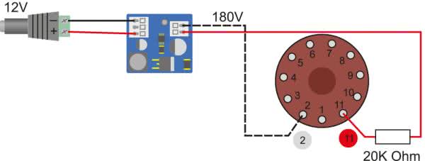 Lampa Nixie typu IN-1 potrzebuje do działania napięcie anodowe równe około 180 V. W zaprezentowanym układzie jest ono generowane przez przetwornicę impulsową typu boost, bazującą na układzie NCH6100HV. Pozwala ona na uzyskanie napięcia zasilania anody lampy, równego 180 V, z napięcia wejściowego 12 V, którym zasilany jest układ. Napięcie wyjściowe trafia na anodę lampy Nixie przez opornik, ograniczający prąd. W przypadku tej lampy autor zastosował z powodzeniem rezystor 20 kΩ.