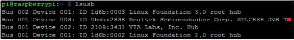 Po ponownym uruchomieniu możemy przetestować poprawne działanie sterowników i modułu. W pierwszej kolejności, po podłączeniu urządzenia RTL-SDR do komputera, listujemy urządzenia USB, podłączone do komputera: