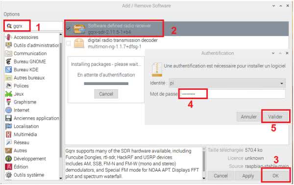 Drugą opcją jest dodanie oprogramowania poprzez interfejs graficzny (rysunek 4). W menu opcji wybieramy dodaj/usuń oprogramowanie (Add / Remove Software) i wyszukujemy gqrx (1), następnie wybieramy pakiet do instalacji (2) i zatwierdzamy (3), co będzie trzeba potwierdzić hasłem (4 and 5). Instalacja zajmie trochę czasu, ponieważ system musi pobrać i rozpakować około 500 MB plików. Może potrwać to około 20 minut lub więcej, zależnie od połączenia internetowego.