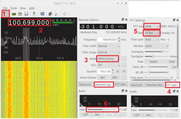 Przed jakimkolwiek konkretnym dekodowaniem ważne jest, aby sprawdzić poprawność działania urządzenia (rysunek 6). Najpierw należy uruchomić oprogramowanie (1), ustawić częstotliwość w paśmie FM (2), wybrać tryb WFM (mono). Jeśli dźwięk jest nierówny, należy dostosować rozmiar pasma FFT i prędkość (5), a na koniec dostosować poziom wyjściowy dźwięku (6). Jeśli jednak dźwięk jest bardzo nierówny, należy zmniejszyć rozdzielczość ekranu i unikać używania przeglądarki VNC Viewer, która zajmuje dużo zasobów procesora.
