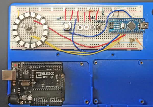Projekt rozpoczął się od nowego szkicu Arduino i obwodu testowego, zbudowanego do przeanalizowania pomysłów autora. Prototypowanie układu najlepiej jest przeprowadzić, dodając do systemu na płytce stykowej poszczególne elementy, krok po kroku. Taktyka ta przydaje się szczególnie w przypadku nieznanych nam dotychczas komponentów. W przypadku autora był to moduł NeoPixel oraz enkoder obrotowy. Dlatego też one w pierwszej kolejności trafiły na płytkę stykową (fotografia 1).