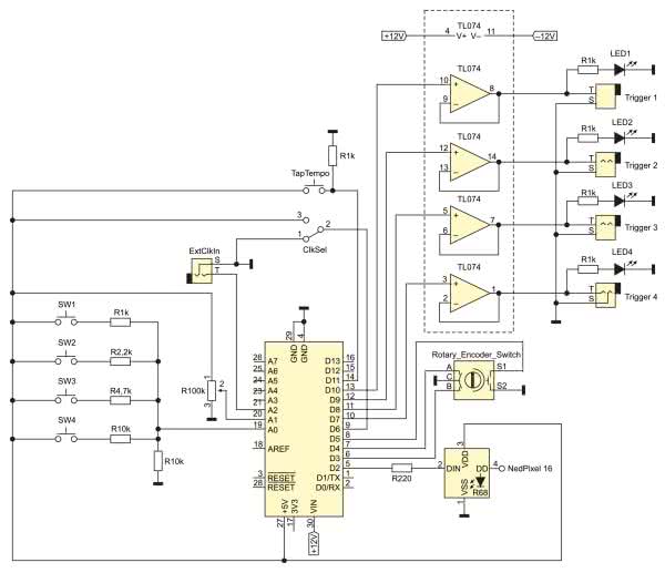 - wyjścia cyfrowe mogą być używane do wyzwalania diod LED lub innych modułów syntezatora.