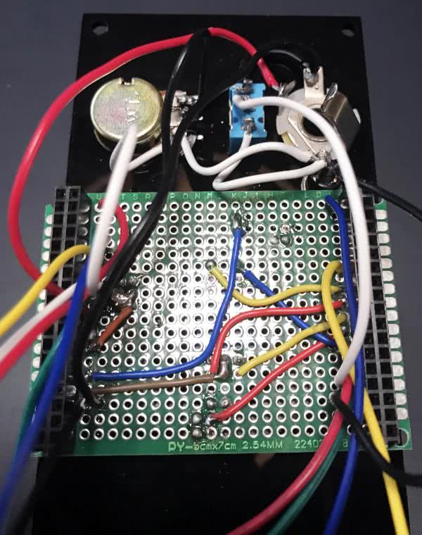 Ostatnia część budowy modułu obejmuje okablowanie gniazd, przycisków, przełącznika, potencjometru i diod LED. Najłatwiej jest zamontować elementy na panelu przed przylutowaniem do nich kabli. Pomoże to w określeniu długości i miejsca prowadzenia przewodów.