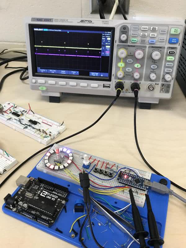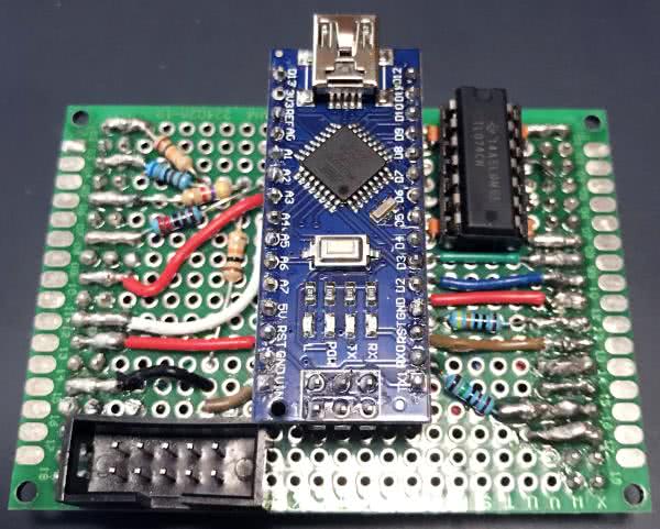 Aby przetestować płytki prototypowe, autor po prostu podłączył zworki do odpowiednich pinów wyjścia cyfrowego w module Nano. To pozwoliło szybko sprawdzić za pomocą oscyloskopu prawidłowe ustawienia wyjść cyfrowych (fotografia 2).