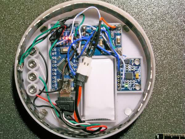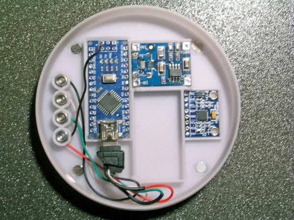Po przykręceniu przewodów należy podłączyć wtyczkę miniUSB do Arduino i wsunąć je na właściwe miejsce. Następnie należy zainstalować płytkę ładowania akumulatora na właściwym miejscu. Na koniec w obudowie można umieścić moduł z akcelerometrem MPU6050 po prawej stronie, obok baterii. Moduł z MPU6050 powinien być skierowany górną stroną do góry, a oś X powinna znajdować się na osi prawa-lewa strona.