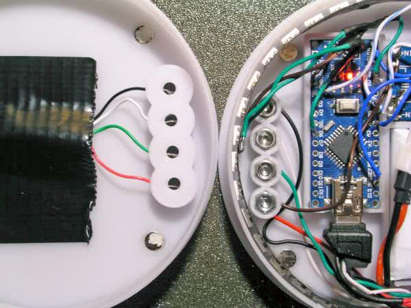 Na kolejnym etapie montażu należy przylutować trzy przewody do paska LED (36 diod). Należy zwrócić uwagę na kierunek propagacji danych w pasku LED i przylutować przewody na jego początku. Jeśli koniec, który mamy przed sobą, jest zaznaczony strzałką, to nie jest to koniec, którego szukamy – przylutujmy przewody na drugim końcu. Trzy przewody przylutowane do paska diodowego to zasilanie, masa i szeregowa linia danych, która służy do programowania kolorów. Masa i zasilanie podłączamy odpowiednio do masy i napięcia z baterii (które dostępne jest na płytce z ładowarką ogniwa). Linia danych dołączana jest do płytki z mikrokontrolerem do cyfrowej linii D6.
