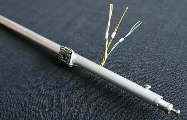 Przez rurkę przeprowadzono 6 przewodów. Można skręcić je w trzy pary – jedna para to zasilanie (VCC i GND), druga para to linie I2C (SDA i SCL), a trzecia to dwie linie Chip Enable do obu sensorów.