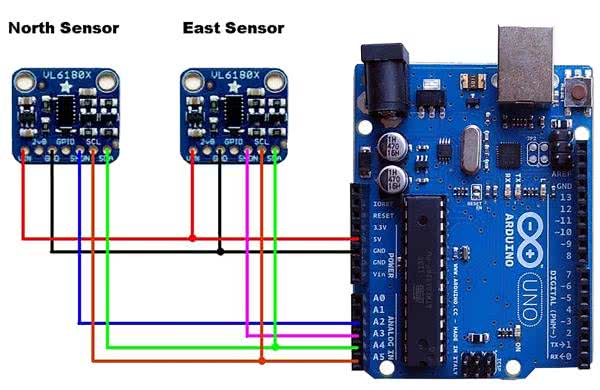 Układ znajdujący się w anemometrze jest bardzo prosty. Sercem systemu jest moduł Arduino – w tym przypadku jest to Arduino UNO R3. Do niego podłączone są dwa laserowe sensory odległości VL6180X. Schemat układu połączeń został pokazany na rysunku 2.