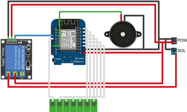 W prawym górnym narożniku płytki umieszczono złącze śrubowe do podłączenia zasilacza. Elektromagnes podłączono za pomocą oryginalnego złącza tego elementu. Masa solenoidu podłączona jest bezpośrednio do masy zasilacza, a dodatnie wyprowadzenie podłączono do zasilacza poprzez normalnie otwarte wyprowadzenie przekaźnika, aby możliwe było łatwe sterowanie. Do modułu przekaźników podłączono także zasilanie strony pierwotnej (5 V oraz masę GND). Linia sterująca przekaźnikiem podłączona jest do pinu D0 w module z mikrokontrolerem. Buzzer podłączony jest do masy i do pinu D7 modułu D1 Mini. Finalnie, do mikrokontrolera podłączono siedem linii klawiatury, do pinów TX, RX i D1...D5, zgodnie z wcześniejszym opisem. Na fotografii 2 pokazano gotowy, zmontowany układ zamontowany w sejfie.