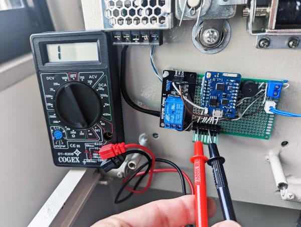 Dodatkowo urządzenie korzysta z gotowej klawiatury, która jest częścią oryginalnego systemu zabezpieczenia sejfu. Najtrudniejszą częścią było zrozumienie, jak działa klawiatura. Aby połączyć ją z nowym systemem, wymagane były działania z zakresu inżynierii wstecznej. Klawiatura sejfu to klasyczna klawiatura macierzowa w formacie 3×4. Oznacza to, że do układu podłączone jest siedem przewodów, po jednym na każdy wiersz i na każdą kolumnę. Wiersze są podciągane do zasilania, kolumny łączone z masą. Po naciśnięciu klawisza zamyka się obwód i w ten sposób kontroler może dowiedzieć się, który klawisz został naciśnięty. Konieczne było ustalenie kolejności przewodów na taśmie wychodzącej z klawiatury i powiązanie każdego z odpowiednim wierszem i kolumną. Wymagało to przeprowadzenia kilku prób. Autor zastosował multimetr w trybie pomiaru diody, aby sprawdzić każdą parę wyprowadzeń (fotografia 1).