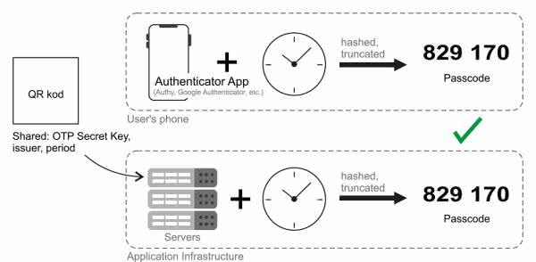 Algorytm korzysta z pewnej formy kryptografii klucza symetrycznego – ten sam klucz jest używany przez obie strony do generowania i walidacji tokena. TOTP działa w trybie offline, co oznacza, że jedyne dane wejściowe do algorytmu TOTP to czas systemowy i przechowywany tajny klucz. Ani dane wejściowe, ani obliczenia nie wymagają połączenia z Internetem w celu wygenerowania lub zweryfikowania hasła jednorazowego. Dlatego użytkownik może uzyskać dostęp do TOTP za pośrednictwem aplikacji w trybie offline.