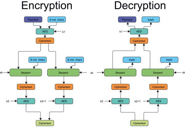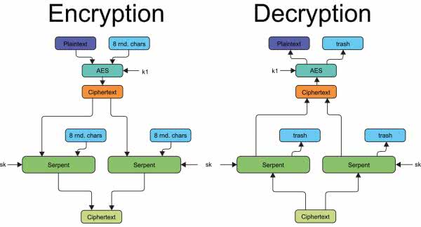 - Każdy z wyników szyfrowania Serpentem jest następnie szyfrowany za pomocą AES z wykorzystaniem drugiego klucza.