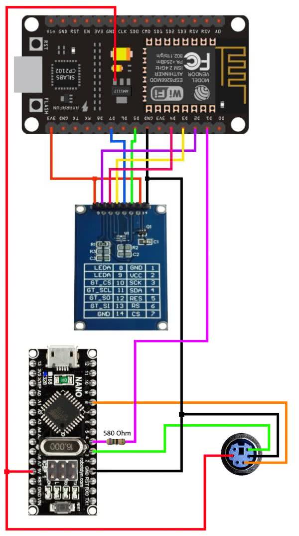 Przy budowie systemu konieczne jest złożenie dwóch względnie niezależnych od siebie urządzeń. Są one dosyć proste, więc ich montaż nie powinien nastręczyć większej trudności. Pierwszym modułem, jaki należy zmontować, jest magazyn haseł. Na rysunku 3 został pokazany schemat urządzenia, według którego należy połączyć poszczególne elementy. Jedynym problematycznym elementem, na jaki możemy natknąć się, montując ten układ, jest podłączenie portu PS/2 do płytki. Może to wymagać precyzyjnego lutowania kabli do złączy, jeśli nie uda nam się nabyć gotowego kabla ze złączem tego rodzaju.