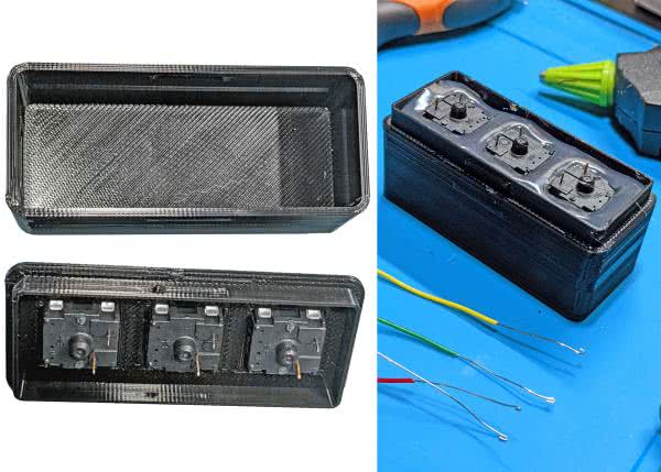 Obudowa została wykonana w technologii druku 3D i składa się z dwóch części. Głębszy element z wycięciem na port USB służy do montażu elektroniki, a wieczko do instalacji przycisków. Mechaniczne przełączniki umieszczane są w wieczku w kwadratowych otworach 14×14 mm (fotografia 1a). W przypadku wykorzystania innego rodzaju przełączników konieczna może być zmiana wielkości bądź geometrii tych otworów – zostały ode dobrane pod kątem instalacji zwykłych przycisków z mechanicznej klawiatury komputerowej. Przyciski powinny ciasno wchodzić w kwadratowe otwory, jakie dla nich przygotowano, w przeciwnym wypadku mogą one przypadkowo wyczepić się z tego miejsca w czasie użytkowania. Dla ich lepszego umocowania w obudowie autor rekomenduje zalanie luk w górnej pokrywie obudowy klejem na gorąco, aby połączenie to było naprawdę solidne (fotografia 1b). Pliki STL do wydrukowania obudowy załączone są do projektu – można pobrać je ze strony projektu [1] i samodzielnie wydrukować obudowę pokazaną na zdjęciach w artykule.