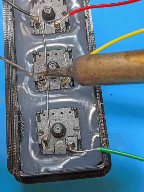 Połączenia te najlepiej jest polutować, aby zapewnić bezawaryjne połączenie. Mechaniczne przełączniki mają raczej małe piny, więc najlepiej użyć szczypiec do zahaczenia i owinięcia końców przewodów wokół niego przed lutowaniem. Każdy z owiniętych przewodem pinów dobrze jest pokryć topnikiem przed ich zlutowaniem w całość. Wystarczy odrobina spoiwa, aby połączyć je w całość, by przewody nie oderwały się przypadkiem podczas eksploatacji. Przewody przycisków można następnie dociąć na równą długość i odizolować z drugiej strony na kilka milimetrów. Ta część przylutowana zostanie do płytki Arduino.
