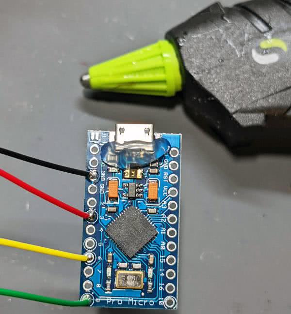 Przed finalnym montażem i zamknięciem układu w obudowie musimy jeszcze dołączyć do modułu Arduino przewód USB. Musi być zakończony z jednej strony wtyczką pasującą do gniazda w module Pro Micro. Druga strona powinna być zakończona wtyczką USB typu A, którą można podłączyć do komputera. Wtyczki USB mają skłonność do rozłączania się, szczególnie microUSB, zastosowane w jednym z klonów Arduino Pro Micro. Dlatego też należy zabezpieczyć wtyczkę w gnieździe płytki za pomocą odrobiny kleju na ciepło.